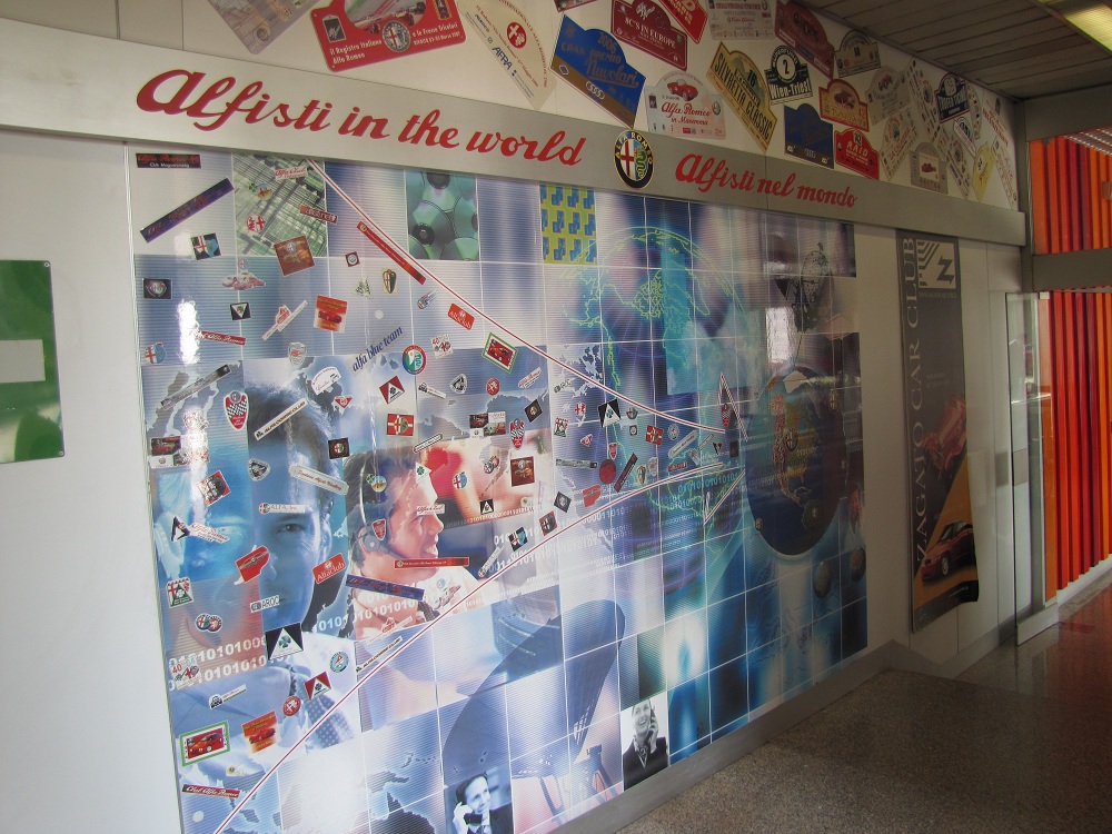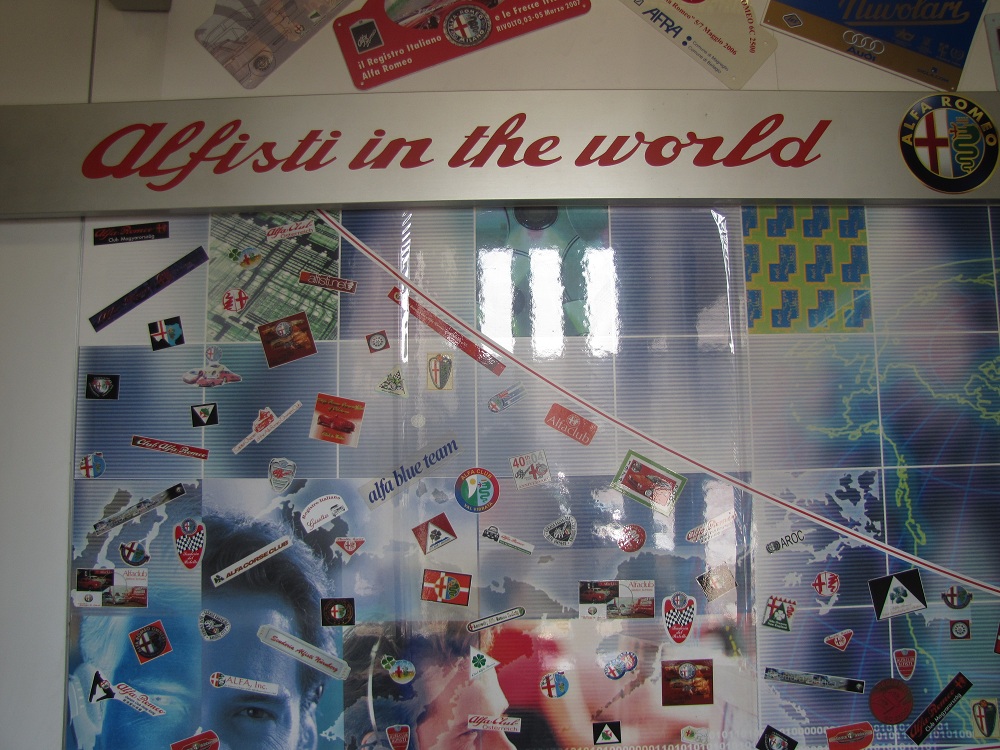 Bello attaccare il logo del nostro club, insieme a tutti gli altri, nella parete “Alfisti nel mondo”, che è all’ingresso degli uffici dello stabilimento, e sembra quasi una prova o un segno quello che, durante il viaggio di ritorno, abbiamo incontrato lungo l’autostrada: una bellissima Alfa Brera di colore blu Misano, che trasportava su un carrello una GTAm d’epoca… lui sì che è un alfista, ma di quelli veri ……….