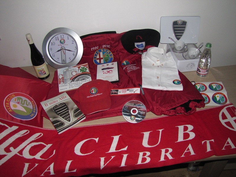 Partendo dal sempre ottimo vino, con tanto di etichetta della manifestazione e dall’acqua del Club dall’ inconfondibile “slogan” “ALTISSIMA, PURISSIMA, ALFISSIMA”; si spazia dall’abbigliamento da utilizzare nei raduni per farsi riconoscere sempre con stile e classe insieme alla propria Alfa Romeo (camicia, gilet, sciarpa e cappellino), al collezionismo (il modellino di Fangio campione del mondo di F1 con l’Alfa Romeo nel 1951), all’essere sempre puntuale nell’abbellire il proprio garage (l’orologio da muro). Piove e tira vento? Niente paura c’è l’immenso ombrello rosso dell’AlfaClub V.V.. Abbiamo consegnato ai nostri soci anche il libro “Il mito Alfa”, diversi DVD e l’indimenticabile piastrella del primo raduno del 2002. Che dire poi del bel servizio di tazzine originali Guzzini con tanto di stemma e scudo sulla confezione? Offrite del caffè ai vostri amici “automobilisticamente” tedescofili … rabbrividiranno … Continueremo a farVi felici sempre con altri e nuovi oggetti … tutti da collezionare … non perdetevi il prossimo raduno !!!