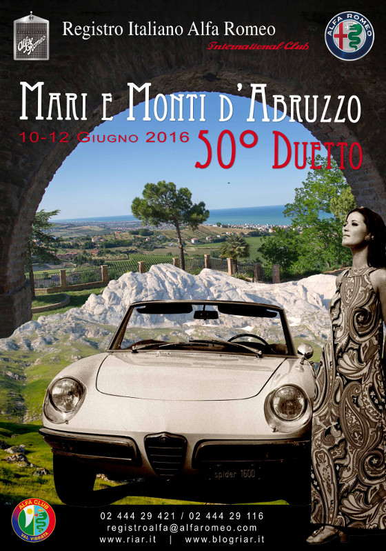 10 - 12 giugno : raduno RIAR con la nostra collaborazione “Mari e monti d’Abruzzo con gli spider Alfa Romeo” con partenza il sabato da Giulianova (Te) verso il Gran Sasso ai Prati di Tivo per poi ritornare al mare, dopo una sosta alla Fortezza di Civitella del Tronto. La domenica il percorso abbraccerà le strade della Val Vibrata attraverso le sue stupende colline fino al mare a Giulianova.